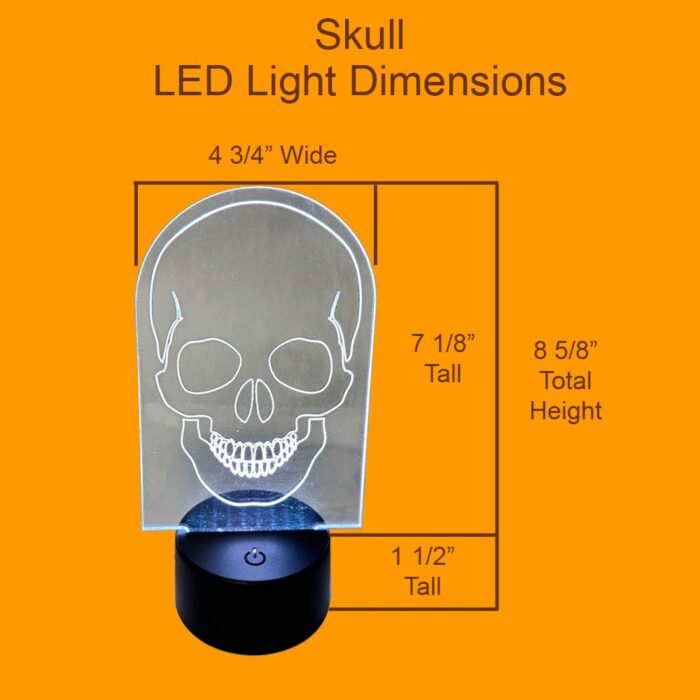 The LED lit acrylic skull is great for Halloween or for a gift for someone in the medical field. The round LED base is 1.5″ tall and 3.5″ diameter.